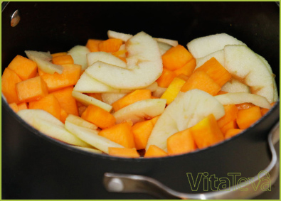 Очистите тыкву и нарежьте ее кубиками. Яблоки, предварительно очищенные от кожуры и серединки, нарежьте ломтиками. Сложите в кастрюлю и добавьте воду и соль. Варите под крышкой на медленном огне до готовности.